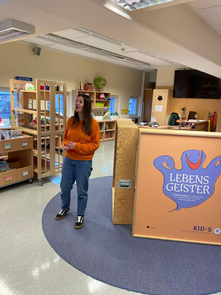 Sie brachte die KIDS KunstBox an unsere Schule. Darin befinden sich Originalwerke der Tiroler Künstler Reinhard Artberg, Ernst Reyer und Irmengard Schöpf.