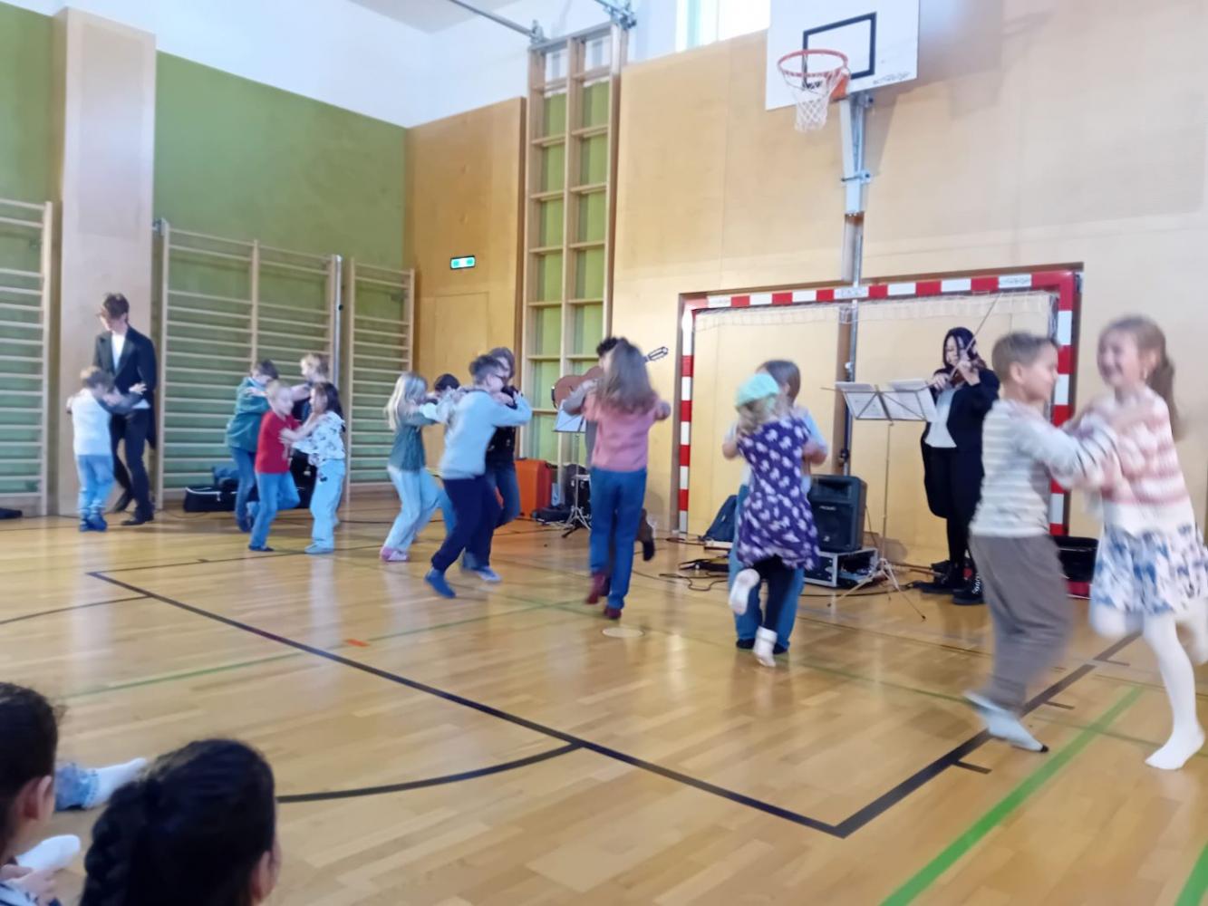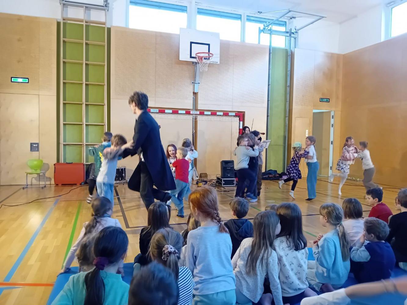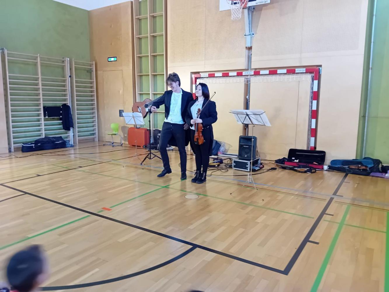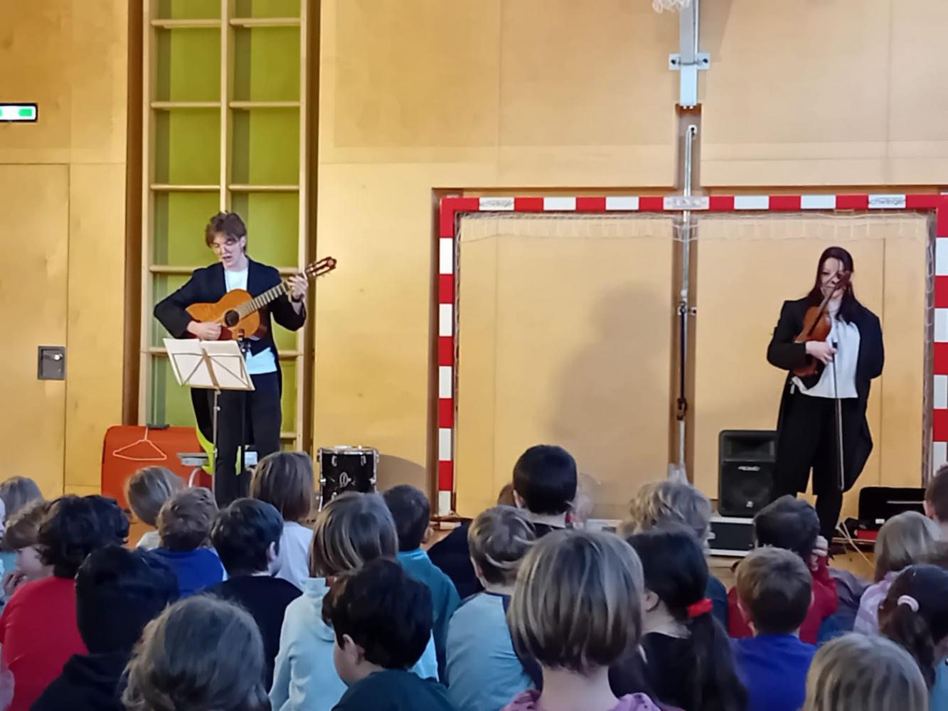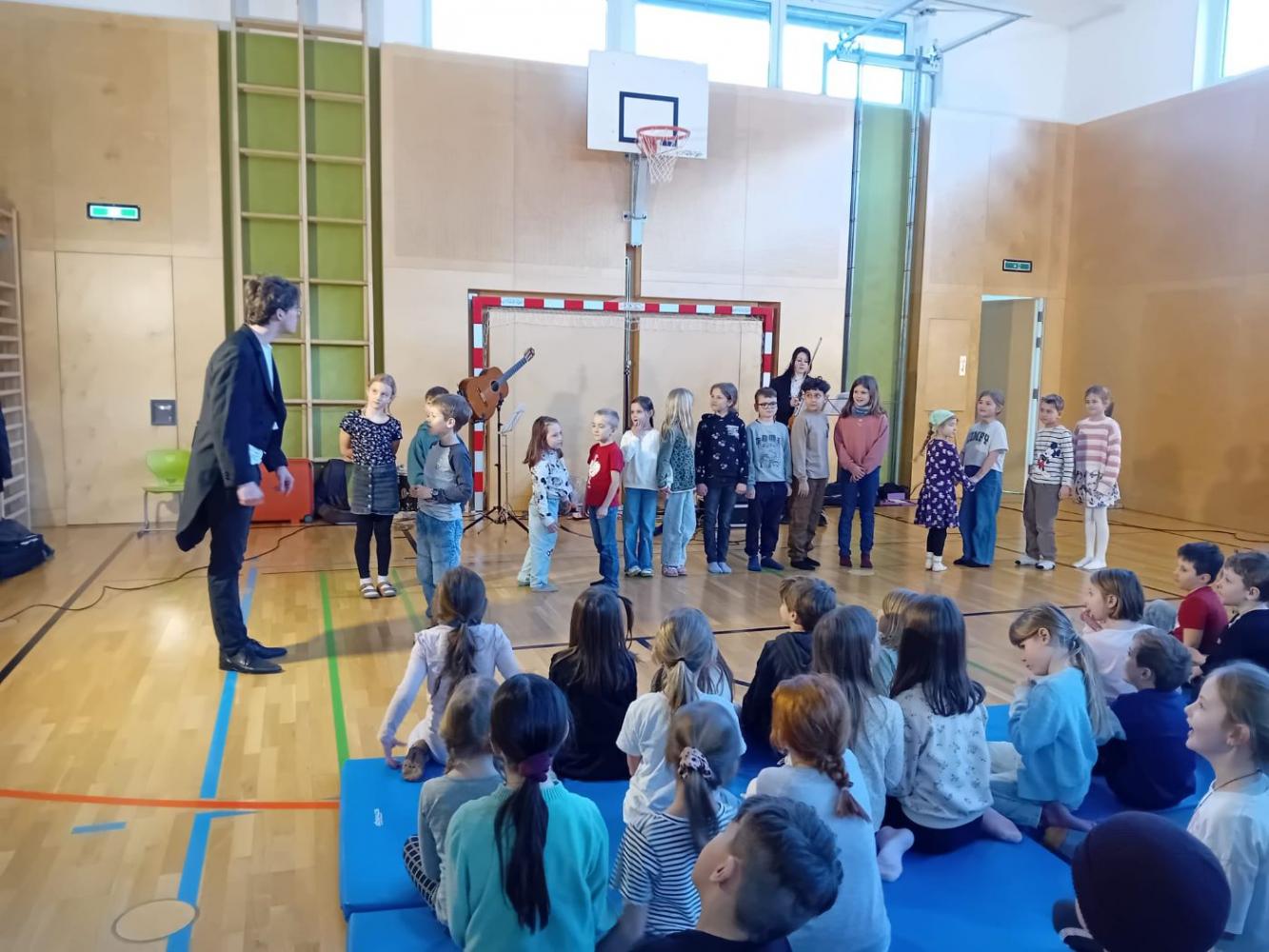 Ein ganz besonderes musikalisches Erlebnis durften unsere Schüler:innen beim Mitmachkonzert „200 Jahre Johann Strauß“ genießen. Die beiden Musikerinnen Johannes und Leana nahmen die Kinder mit auf eine klingende Reise durch die Welt des berühmten Wiener Komponisten. Mit Geige und Gitarre ließen sie einige der bekanntesten Werke von Johann Strauß lebendig werden und verwandelten unseren Turnsaal in einen Konzertsaal voller Musik, Bewegung und Spaß.