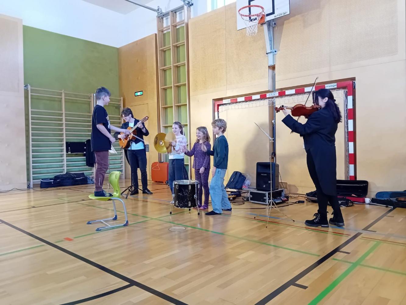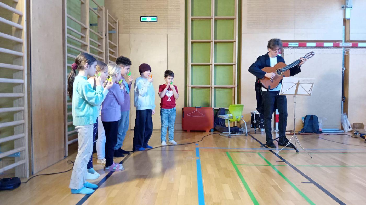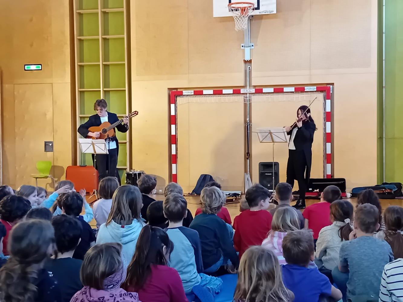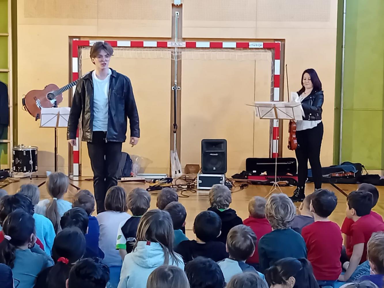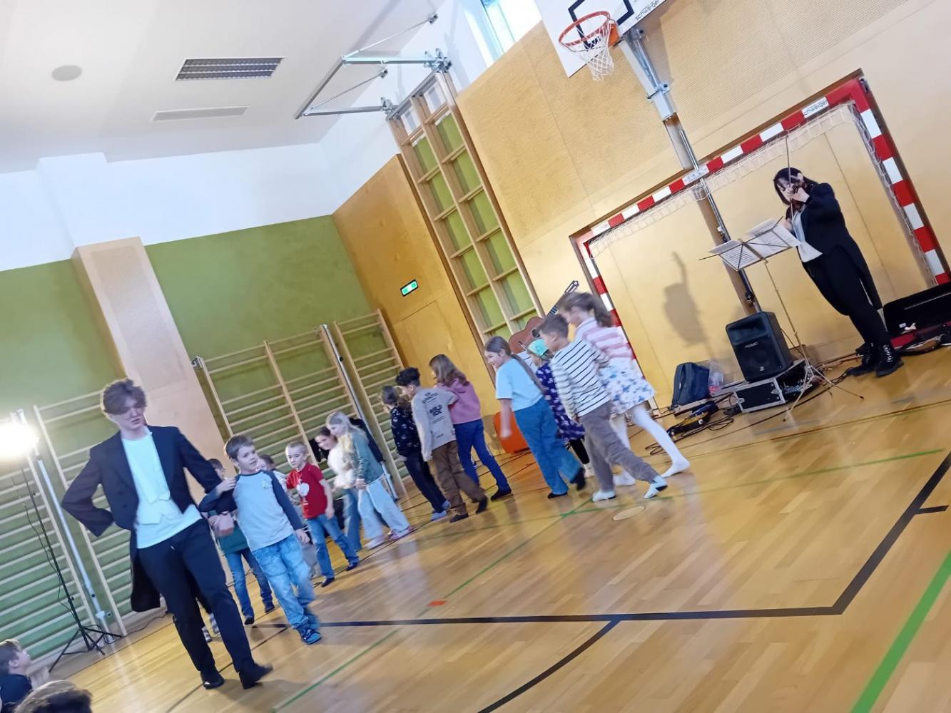 Ein ganz besonderes musikalisches Erlebnis durften unsere Schüler:innen beim Mitmachkonzert „200 Jahre Johann Strauß“ genießen. Die beiden Musikerinnen Johannes und Leana nahmen die Kinder mit auf eine klingende Reise durch die Welt des berühmten Wiener Komponisten. Mit Geige und Gitarre ließen sie einige der bekanntesten Werke von Johann Strauß lebendig werden und verwandelten unseren Turnsaal in einen Konzertsaal voller Musik, Bewegung und Spaß.