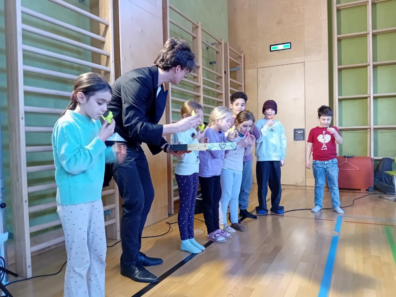 Schon nach den ersten Tönen war klar: Hier wird nicht nur zugehört, hier wird mitgemacht! Die Kinder wurden eingeladen, selbst Teil des Konzerts zu werden und das taten sie mit großer Begeisterung. Bald tanzten sie fröhlich Polka und schwebten im Walzertakt durch den Raum. Ein besonderes Highlight war der Moment, als mutige Kinder mit Vogelgezwitscher das Lied „ Im Krapfenwaldl“ mit ganz besonderen „Vogelinstrumenten“ begleiteten.