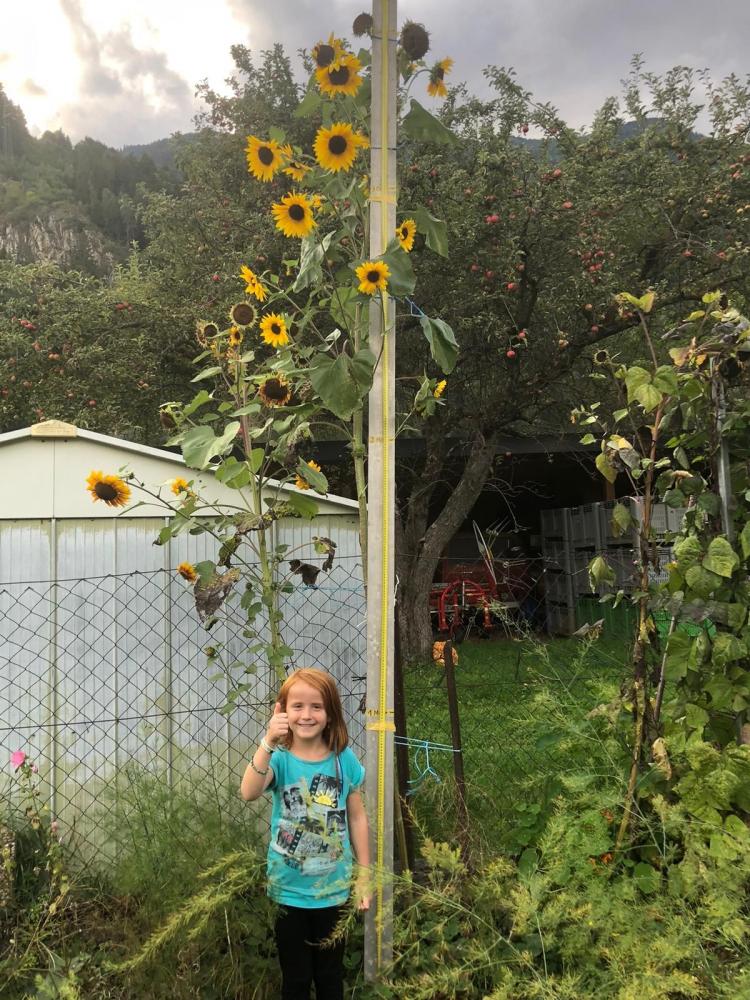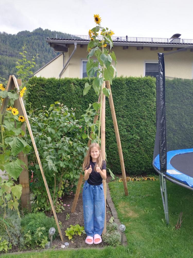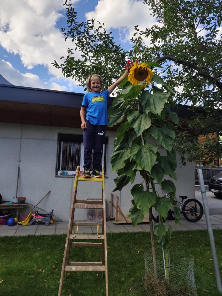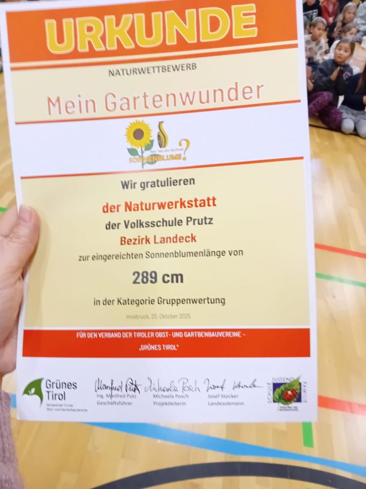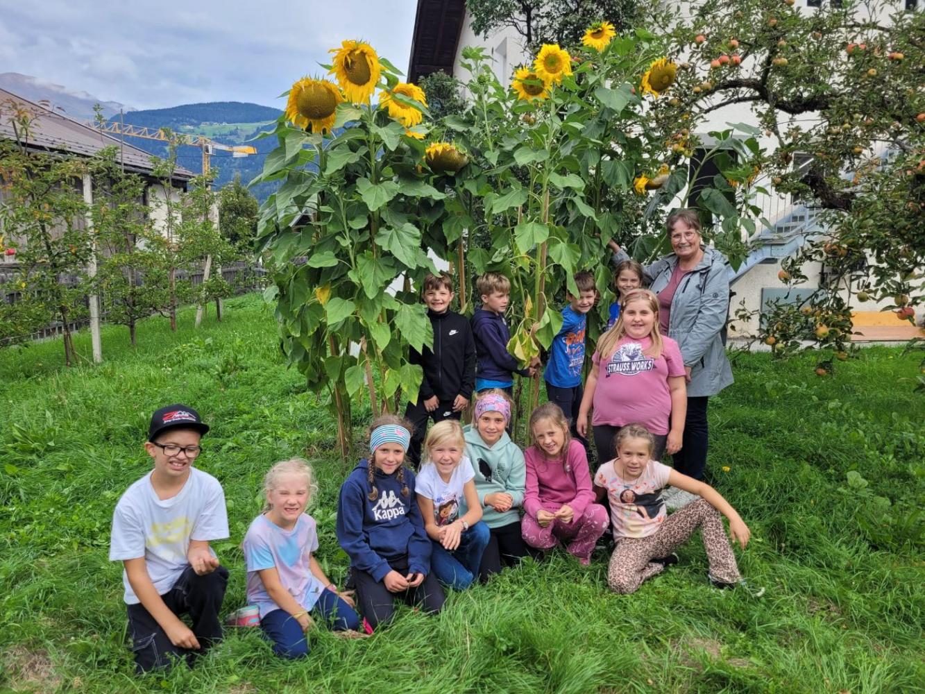 Insgesamt nahmen 30 Kinder aus unserer Schule beim heurigen Naturwettbewerb vom Verband der Tiroler Obst- und Gartenbauvereine „Wer hat die höchste Sonnenblume?“ teil. Auch in unserem Schulgarten wuchsen zahlreiche Sonnenblumen, die von den Kindern der Naturwerkstatt (Wahlpflichtfach) angebaut wurden. Die Länge der höchsten Sonnenblume an unserer Volksschule beträgt 391 cm und wurde von einer Schülerin aus der 2. Klasse liebevoll aufgezogen. Damit erreichte sie in der Einzelwertung im Bezirk Landeck den 8. Platz. Zur feierlichen Übergabe der Urkunden an alle teilnehmenden Kinder versammelten wir uns im Turnsaal.