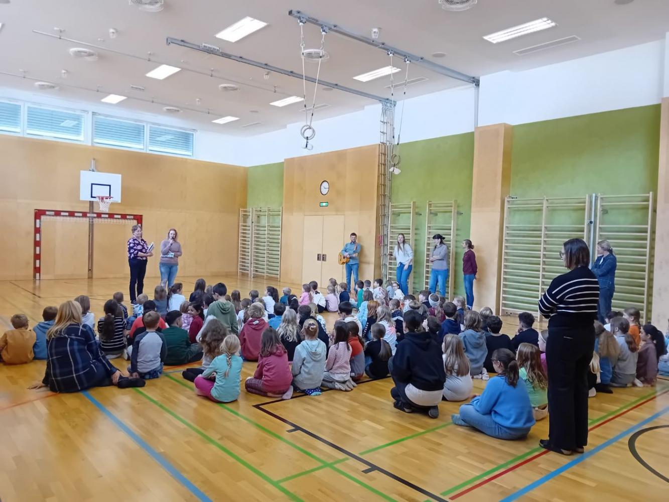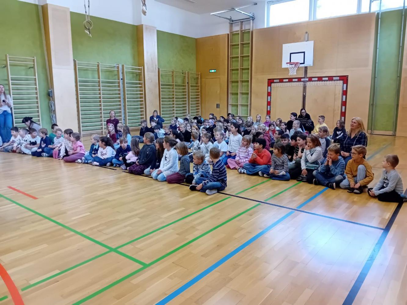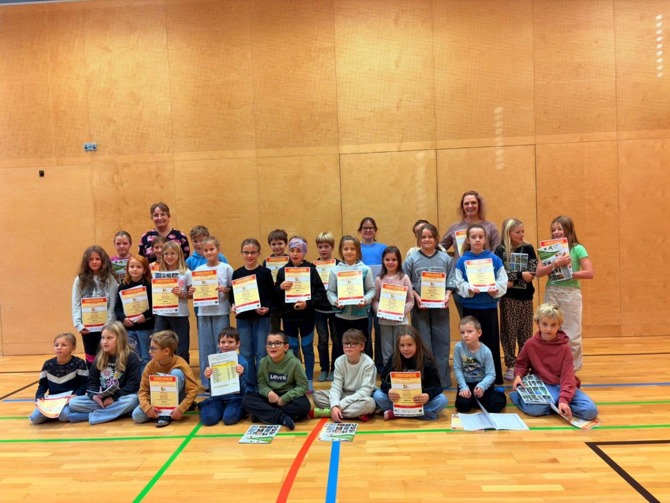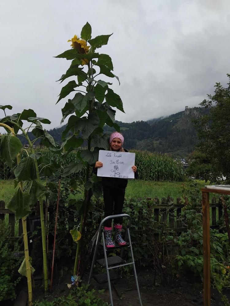 Insgesamt nahmen 30 Kinder aus unserer Schule beim heurigen Naturwettbewerb vom Verband der Tiroler Obst- und Gartenbauvereine „Wer hat die höchste Sonnenblume?“ teil. Auch in unserem Schulgarten wuchsen zahlreiche Sonnenblumen, die von den Kindern der Naturwerkstatt (Wahlpflichtfach) angebaut wurden. Die Länge der höchsten Sonnenblume an unserer Volksschule beträgt 391 cm und wurde von einer Schülerin aus der 2. Klasse liebevoll aufgezogen. Damit erreichte sie in der Einzelwertung im Bezirk Landeck den 8. Platz. Zur feierlichen Übergabe der Urkunden an alle teilnehmenden Kinder versammelten wir uns im Turnsaal.