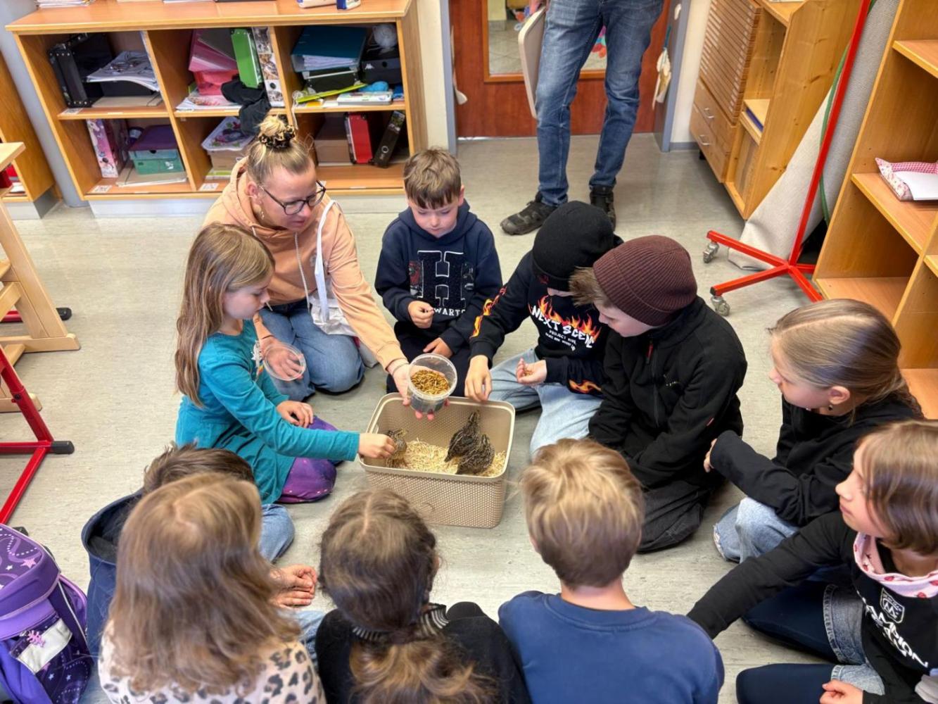 Gemeinsam saßen wir im Sitzkreis, während die Wachteln frei im Raum herumliefen. Die Kinder konnten die Tiere aus nächster Nähe beobachten, sie vorsichtig streicheln und sogar mit Mehlwürmern füttern. Besonders schön war, dass die zutraulichen Wachteln immer wieder zu den Kindern kamen und sich sogar kuscheln ließen.